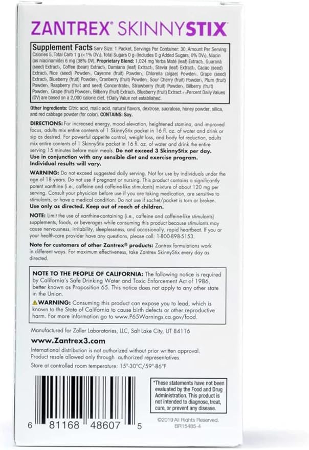 Zantrex SkinnyStix Energy Powder – Lose Weight, GLP-1, Appetite Suppressant, Boost Mood – 10 Calories – Yerba Mate, Coffee Bean – 30 Stix, Berry