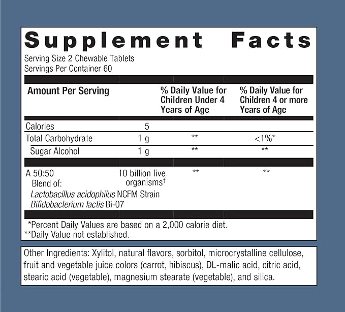 - Tasty Chewables: Our children's probiotic comes in grape-flavored tablets that children love, making daily supplementation an easy habit