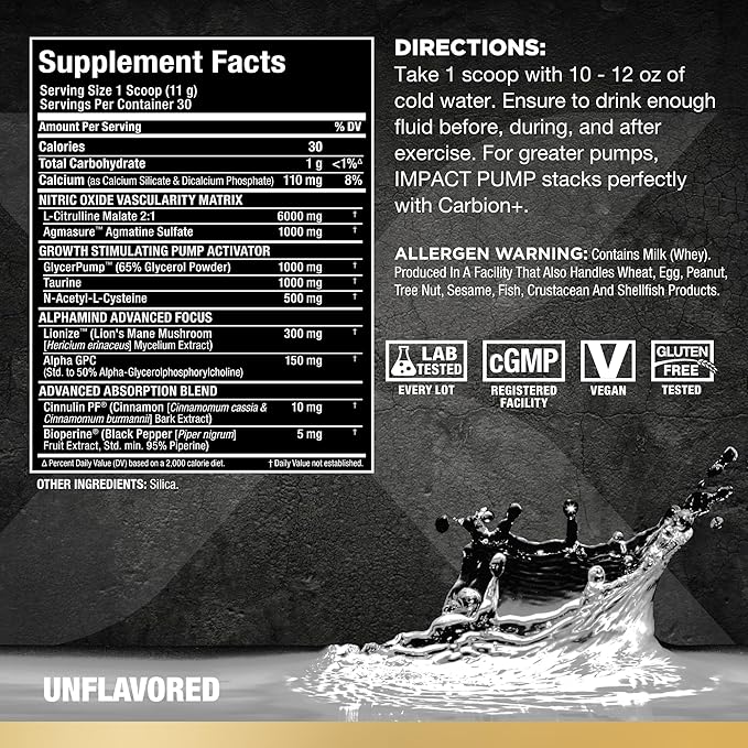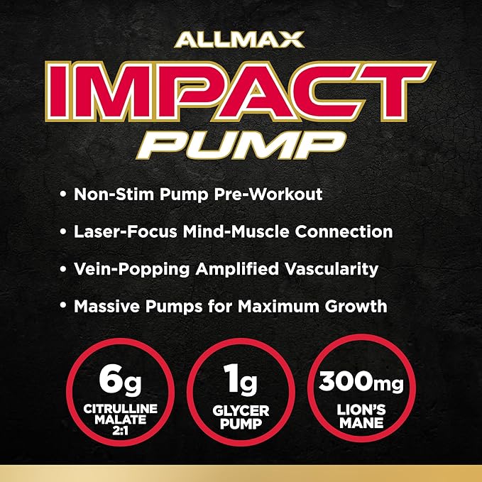 - AMPLIFY YOUR GAINS - Power your pump without the stims with ALLMAX IMPACT PUMP. It’s loaded with the same powerful ingredients found in IMPACT IGNITER, but it’s also fortified with GlycerPump Glycerol Powder to take your pumps to a new level.