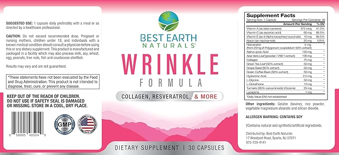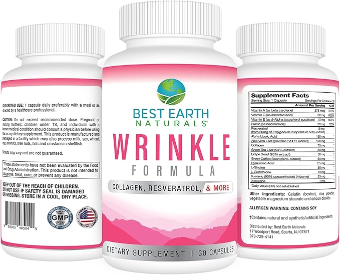 - Collagen Wrinkle Formula: Our supplement includes collagen, resveratrol, glutathione, hyaluronic acid, niacinamide, vitamins and more.