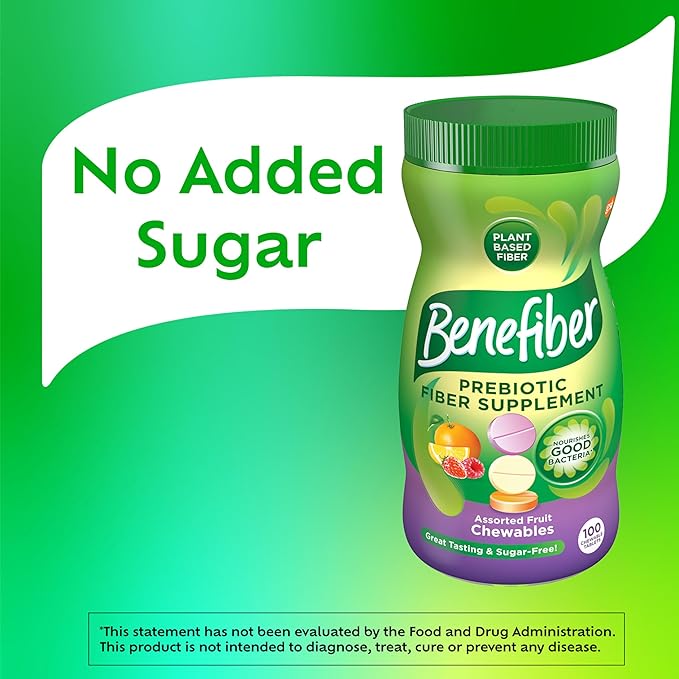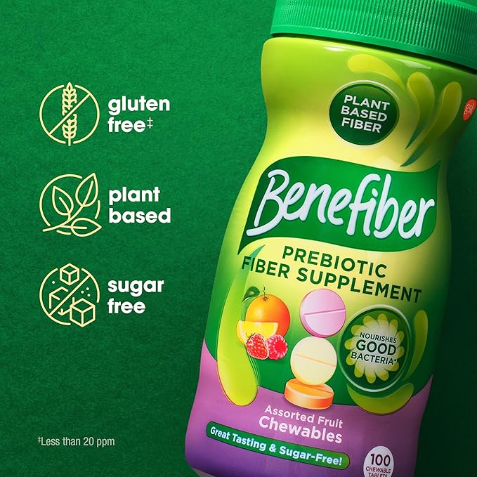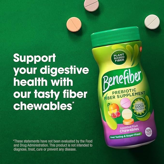 - One 100 count bottle of Assorted Fruit-flavored Benefiber Chewable Prebiotic Fiber Supplement Tablets for Digestive Health (1)
