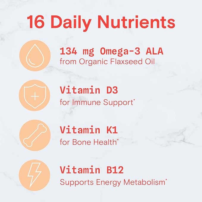 - With Over 13 Nutrients to Support Growing Bodies*: Our science-backed formula includes vitamins K2, D3, B12, and A, as well as vegetarian Omega-3 ALA - meaning kids get the benefits of a daily dose of multi and omegas all in a delicious serving