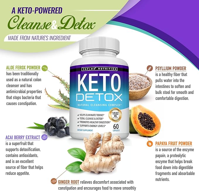 - ★Maximize the Results - Detoxifying is a healthy way to prepare the body for keto diet. Taking Acai Berry Cleansing Complex while exercising is a natural way to sustain your ketosis levels. Keto Detox is made with plant-based ingredient such as psyllium husk (fiber), Acai berry extract slippery elm, ginger root and more that helps cleanse toxins and support healthy bowel movements. Detox supplement can alleviate and reduce bloating and can aid in the elimination of waste and toxins.
