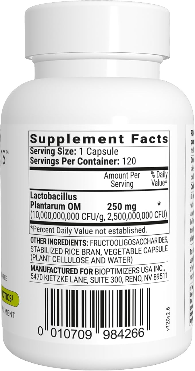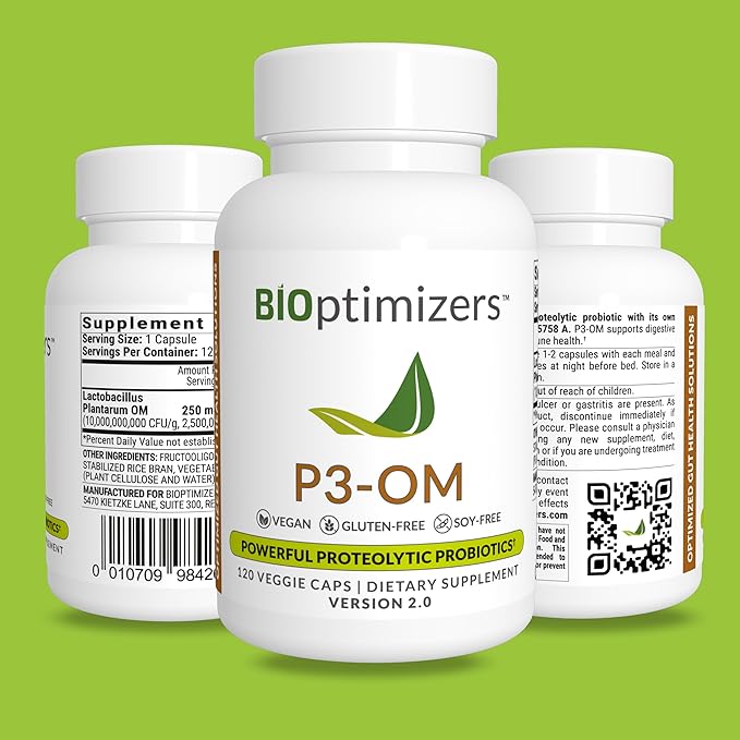 BiOptimizers P3-OM Proteolytic Prebiotics & Probiotics Supplement – Lactobacillus Plantarum for Digestive & Immune Health – Bloating & Gut Relief Support for Men & Women (120 Vegan Capsules)