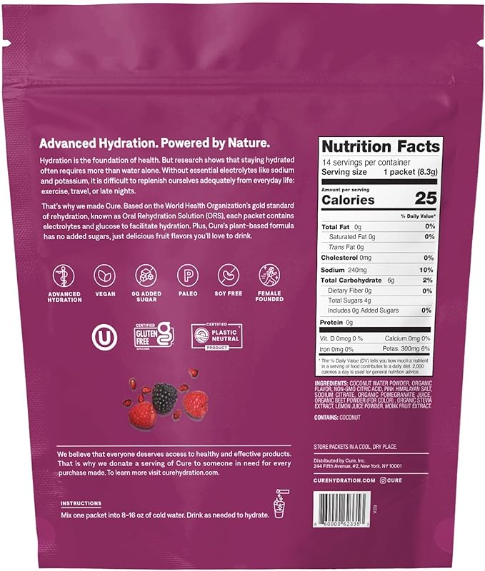 Cure Hydrating Plant Based Electrolyte Mix | Powder for Dehydration Relief | Made with Coconut Water | Non-GMO | No Added Sugar | FSA & HSA | Vegan | Pouch of 14 Packets - Berry Pomegranate