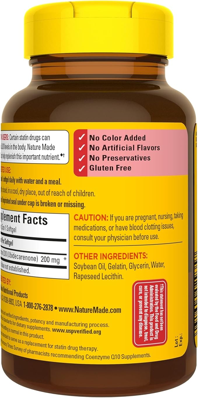 - Heart health support supplement: contains one 100 count bottle of Nature Made CoQ10 200 mg Softgels for an 100-day supply