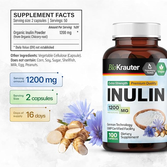 • Extracted from Nature: Our fiber powder supplements are extracted from chicory root fiber, ensuring they are derived from natural sources and free from GMOs. Additionally, we use vegetable cellulose for BioKrauter inulin capsules, making them vegan.