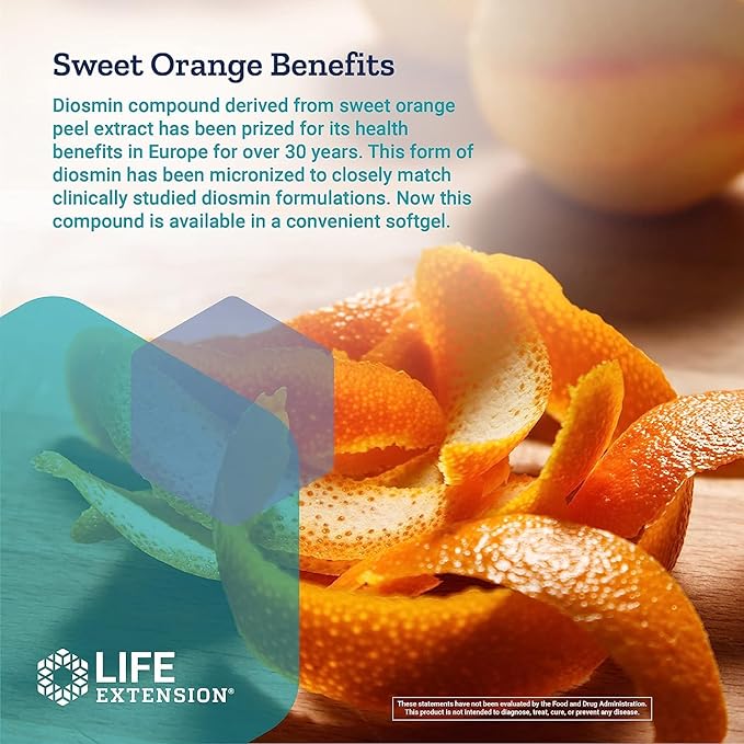 - SWEET ORANGE BENEFITS - Diosmin compound derived from sweet orange peel extract has been prized for its health benefits in Europe for over 30 years. This form of diosmin has been micronized to closely match clinically studied diosmin formulations. Now this compound is available in a convenient softgel
