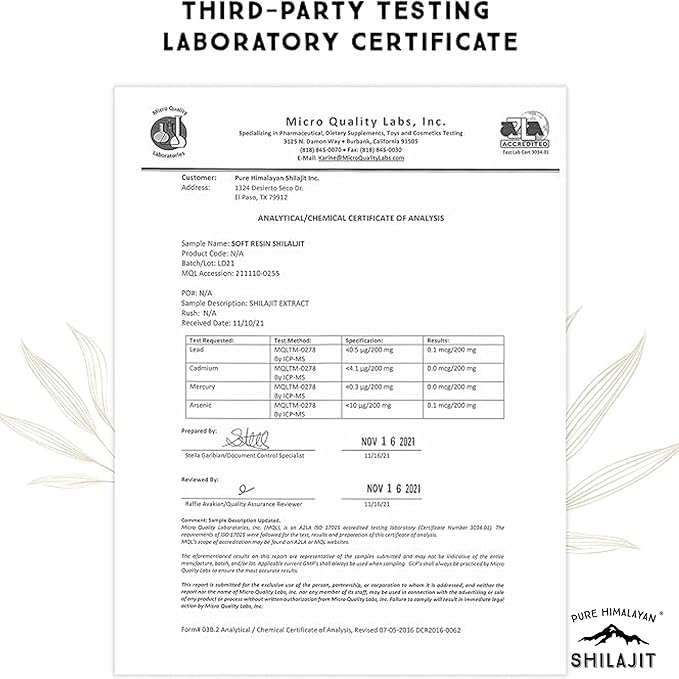 - WHAT YOU GET: Packaged in a light-protected glass jar with a measuring spoon and instructions, our shilajit is easy to use and store. Furthermore, each batch undergoes thorough analysis for safety by a third-party US laboratory, ensuring peace of mind and quality assurance for our customers.