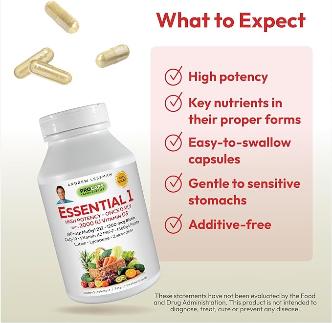 ANDREW LESSMAN Essential-1 Multivitamin 2000 IU Vitamin D3 360 Small Capsules – 100 mcg Methyl B12. CoQ10 Lutein Lycopene Zeaxanthin. High Potency. No Additives. Gentle Ultra-Mild. One Daily Capsule