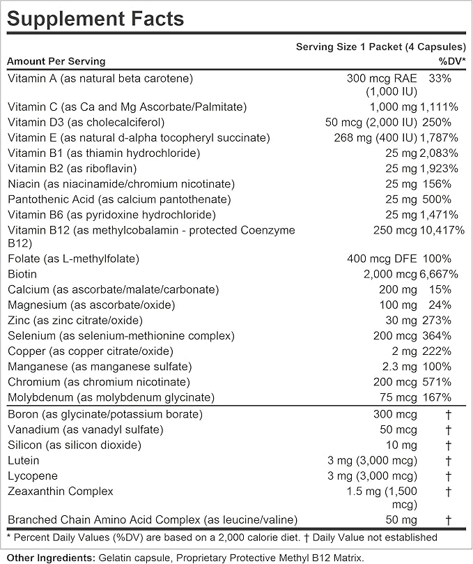 - SUPERIOR 100% PURE BIO-ACTIVE INGREDIENTS – Provides high potencies of all essential vitamins, minerals and carotenoids, including Vitamin A, vitamin C, Vitamin D3, Vitamin E, B-complex vitamins, Calcium, Magnesium, Zinc, Selenium, Copper, Manganese, Chromium, Molybdenum, Boron, Vanadium, Silicon, Lutein, Lycopene, Zeaxanthin and Branched Chain Amino Acid. Contains NO Milk / Dairy-Free, Gluten-Free; NO Additives or Common Allergens of Any Kind.