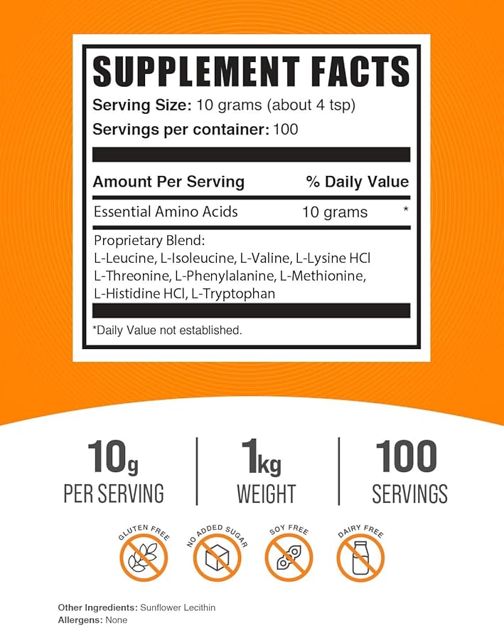 - Maximize your Potential: Enhance your active lifestyle with our Essential Amino Acids powder, or EAA powder, designed to support your strength and performance goals. Each serving delivers a substantial 10 grams dose, catering to both fitness enthusiasts looking to push their limits.