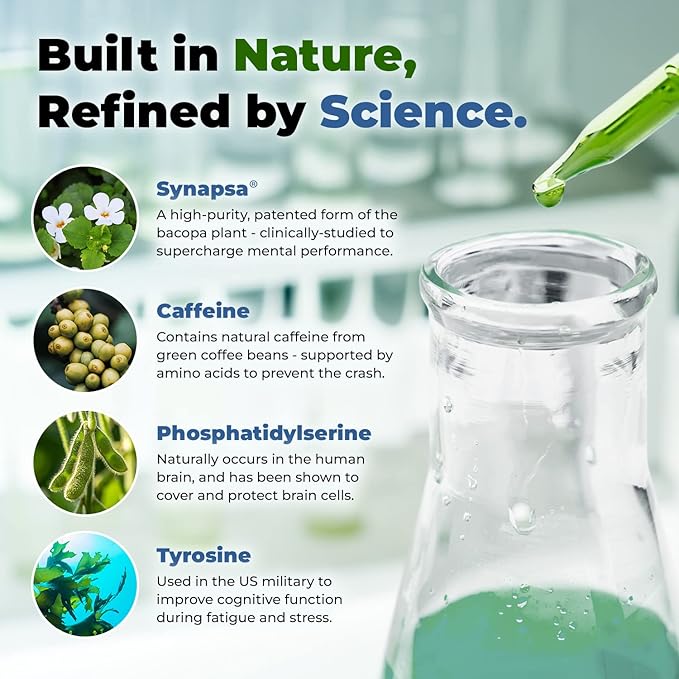 - CLINICALLY STUDIED INGREDIENTS: Built by nature and refined by science, we've utilized premium ingredients proven to enhance cognitive function, including bacopa, L taurine, natural caffeine, GABA, L tyrosine, and Huperzine A.
