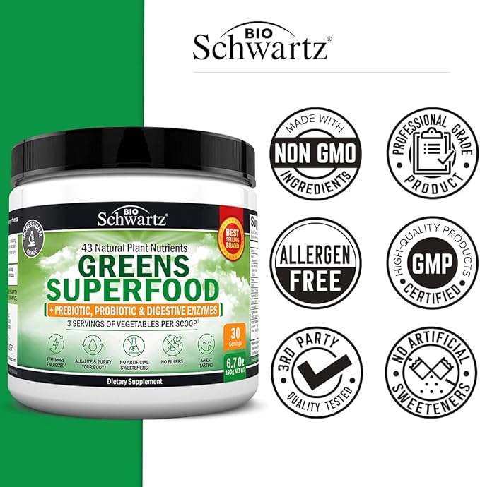 - 3 servings of chlorophyll rich green veggies in every scoop: BioSchwartz greens superfood is loaded with a blend of organic whole foods including super fruits, vegetables, grasses, and marine greens. Every scoop contains 3 full servings of nutrient-rich veggies that promote whole body health, intestinal support, and increased energy levels