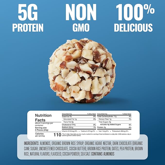 - RIDICULOUSLY TASTY CHOCOLATE ALMOND BITES: Decadent yet completely guilt free, these delicious protein power balls combine crunchy California almonds with organic dark chocolate in snack size energy bites that will rock your world.