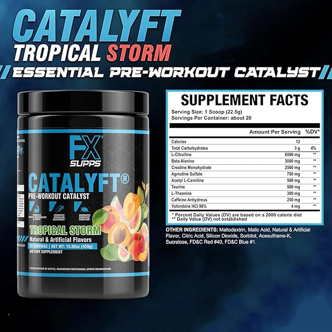 Catalyft Pre-Workout Powder Drink for Men & Women, Tropical Storm | Mix with Creatine, Caffeine & Beta-Alanine | Best for Energy Pump, Muscle Gain and Focus, 20 Servings (1-Pack)