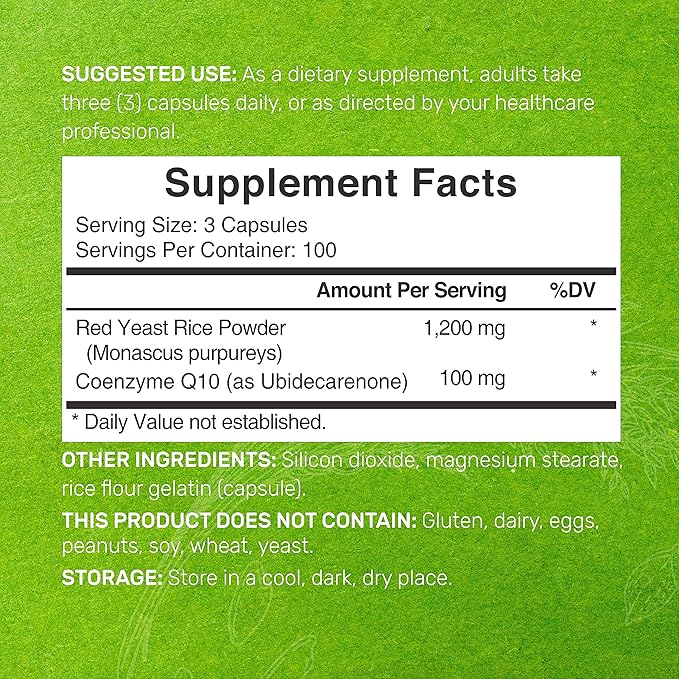 - Dosage & Servings – 300 capsules per bottle, 3 capsule serving size, delivers 1,200mg red yeast rice powder with 100mg of CoQ10 as ubidecarenone per dose, lasts over a 3-month supply (100 servings).