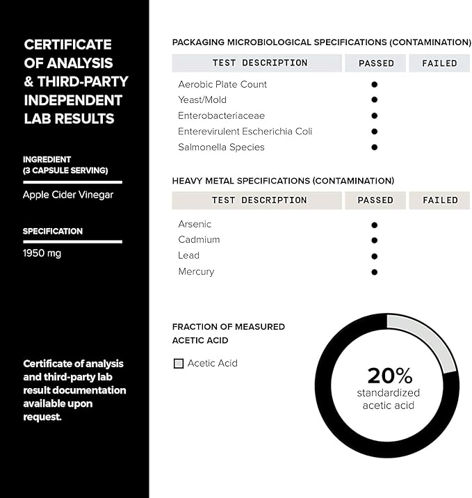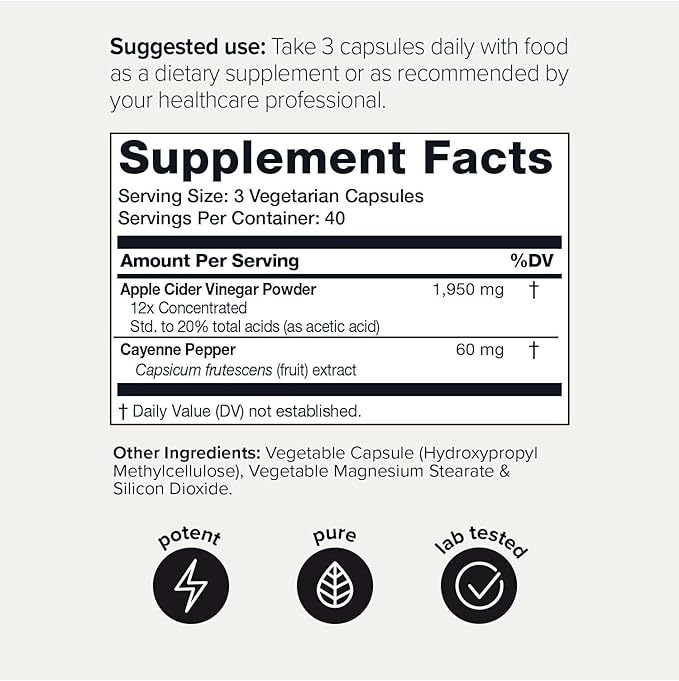 - Product Benefits : Non-GMO ACV Capsules with Mother; 20% Acetic Acid; 2,010mg Formula with Cayenne Pepper;12x Potent;3rd Party Tested Non-GMO ACV Capsules with Mother; 20% Acetic Acid; 2,010mg Formula with Cayenne Pepper;12x Potent;3rd Party Tested