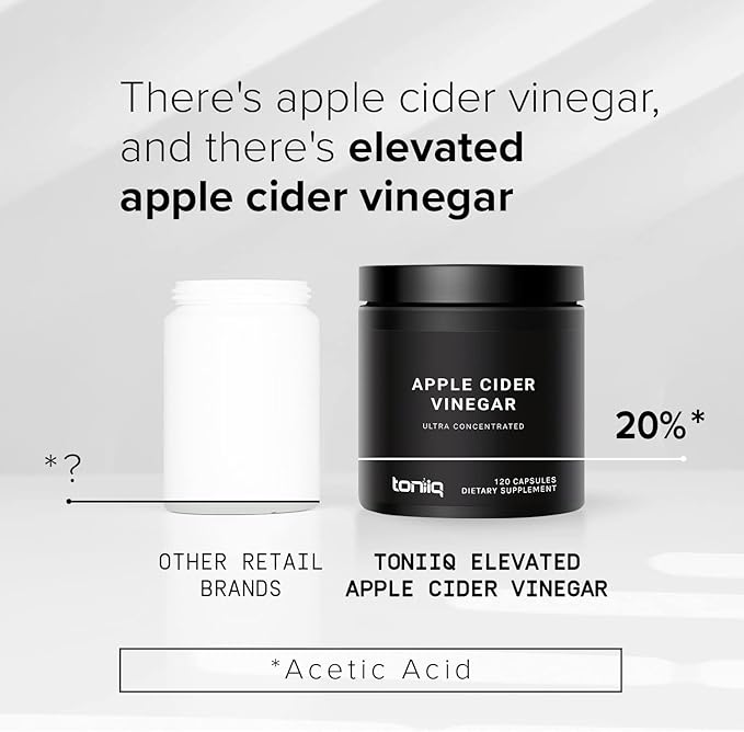 - The Highly Active Form of Apple Cider Vinegar - Toniiq Apple Cider Vinegar Pills contain 1,950mg of the highest quality ACV extract in each serving– ethically sourced and cultivated using an extraction process to ensure 20% acetic acid content (other apple cider vinegar gummies contain 3% or less). Acetic acid is one of the most studied compounds in apple cider vinegar for its beneficial health effects.