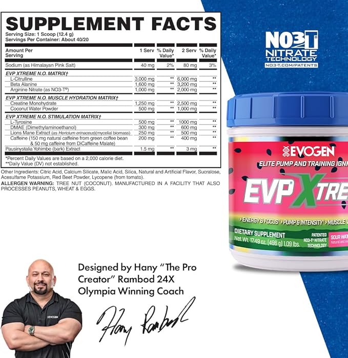 - DESIGNED BY THE PRO CREATOR – Developed by Hany Rambod, 25X Olympia-winning coach, EVP Xtreme N.O. is a clean pre workout supplement built on cutting-edge science to maximize pump, energy, and mental focus so you can train like a champion.