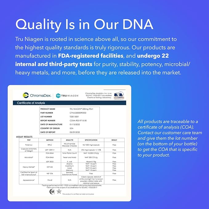 - TESTED FOR SAFETY, POTENCY, AND PURITY – Tru Niagen is one of the most well-studied, patented, supplements. Our Patented Ingredient Niagen has achieved regulatory acceptance by the US FDA for use in supplements: twice as an NDI (New Dietary Ingredient), and once as GRAS (Generally Recognized As Safe). Every batch is made in the United States with globally sourced ingredients and third-party tested by ISO/IEC accredited labs for potency, safety, and purity. Tru Niagen NAD+ capsules are vegetarian, gluten free, nut free, caffeine free, and have no artificial flavors or colors