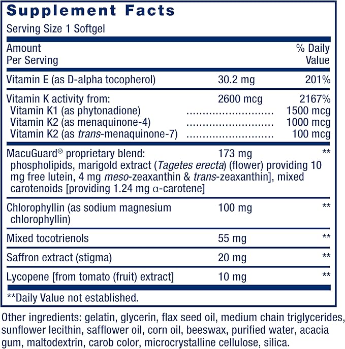 - Primary Supplement Type : Chlorophyllin, MacuGuard® proprietary blend, Vitamin E, Mixed Tocotrienols, Vitamin K