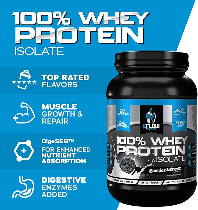 eFlow Nutrition 100% Whey Protein Isolate - Lactose-Free Digestive Enzymes Added, Low Carb, Post Workout Shake, Fast Digesting for Optimal Muscle Recovery - Cookies & Cream (26 Servings)