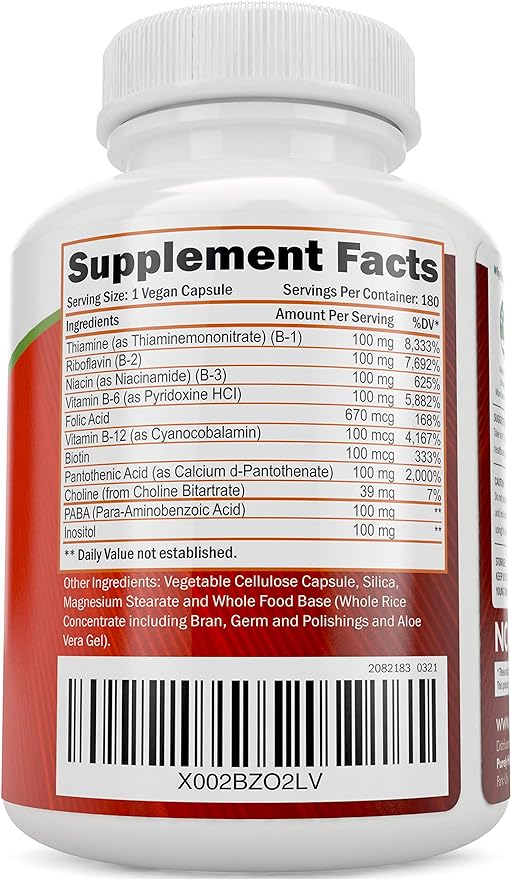 Vitamin B Complex - 8 Super B Complex Vitamins with Choline & Inositol, Vitamins B1, B2, B3, B5, B6, B8, B9 & B12 - B100 Complex - 180 Vegan Capsules - 6 Month Supply - Made in The USA