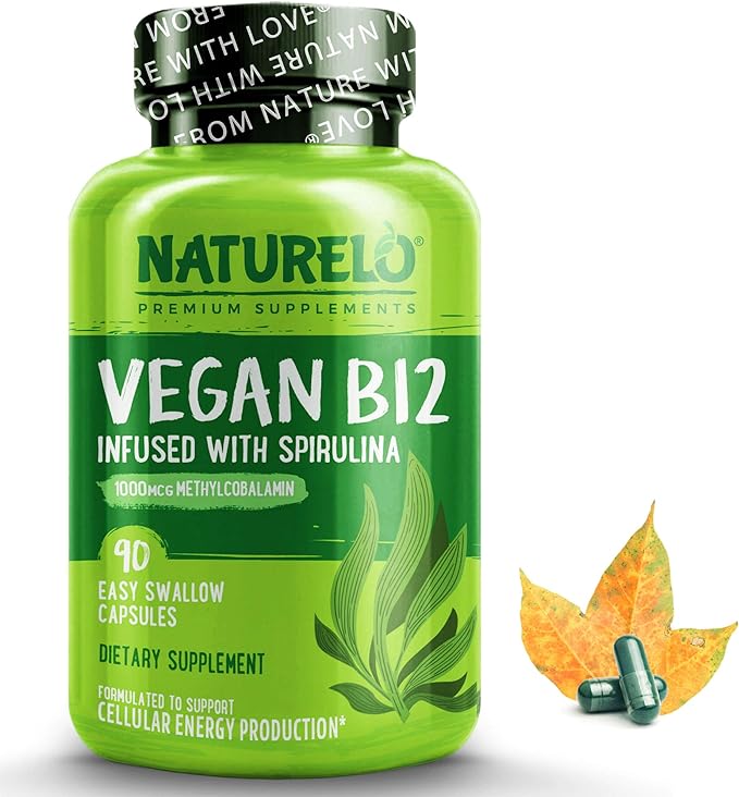 NATURELO Vegan B12 - Methyl B12 with Organic Spirulina - High Potency Vitamin B12 1000 mcg Methylcobalamin - Supports Healthy Mood, Energy, Heart & Eye Health - 90 Capsules