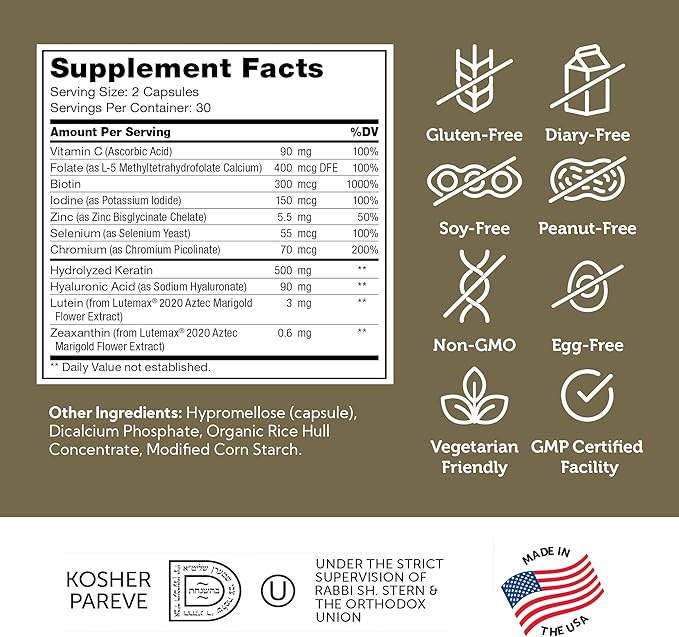 - VEGETARIAN & KOSHER INGREDIENTS - Vegetarian-friendly skin, hair and nails vitamins for women and men. Kosher certified, non-GMO, and free from gluten, soy, and dairy. We are committed to providing natural nutrition and wellness through trustworthy, science-backed supplement products.