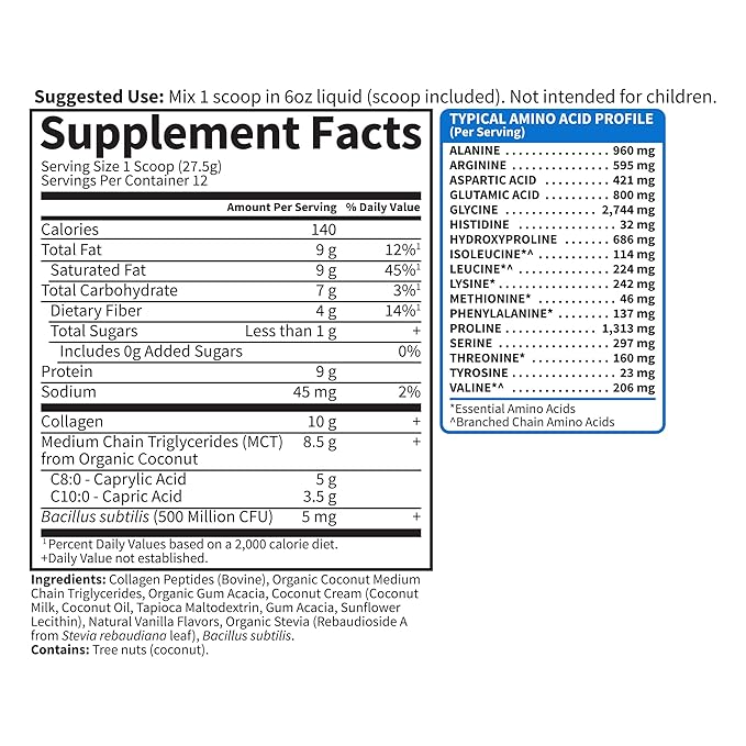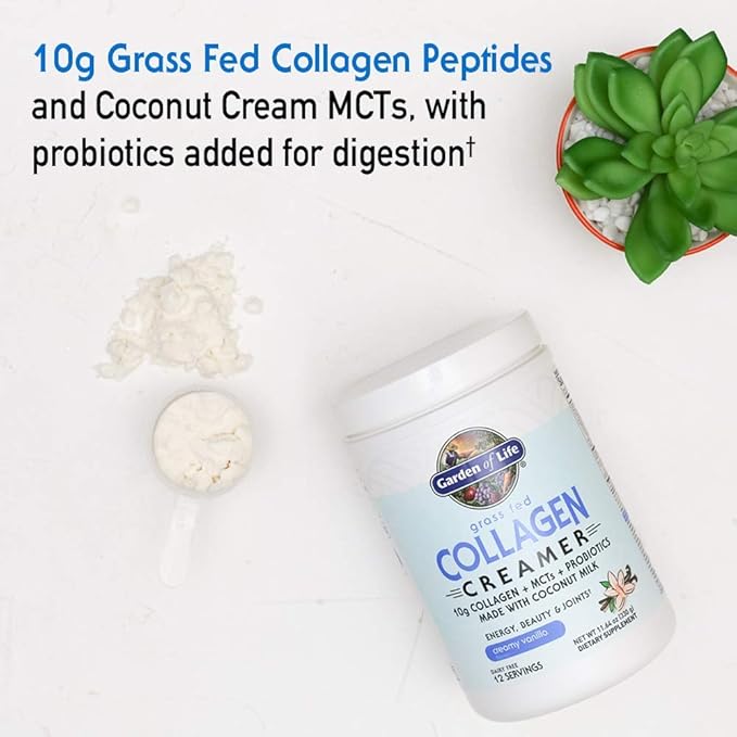 - COLLAGEN CREAMER POWDER FOR RADIANT SKIN, BEAUTIFUL HAIR AND NAILS: Support healthy hair, skin, nails and joints with Grass Fed Collagen and 8.5g Coconut MCTs, plus 500 Million CFU Probiotics for digestion, in a delicious Vanilla flavor