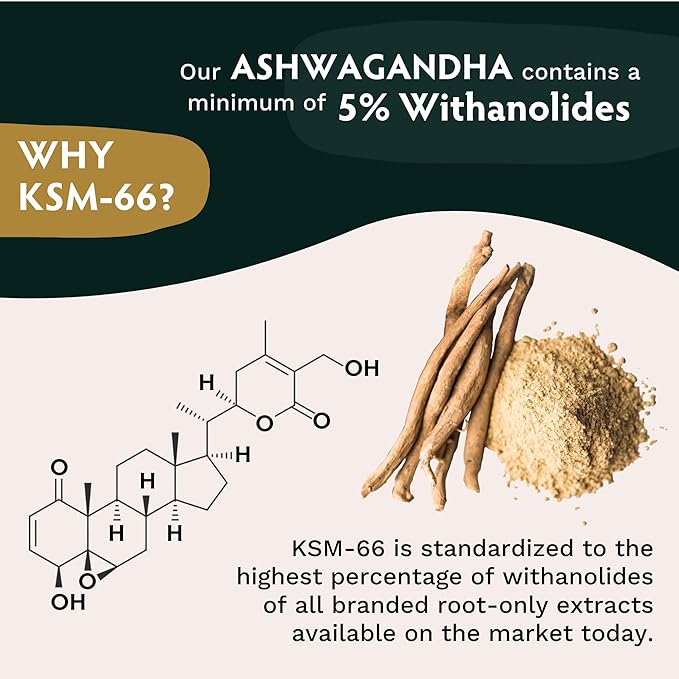 - FULL SPECTRUM ORGANIC KSM-66 ASHWAGANDHA: Our organic KSM-66 ashwagandha vegan capsules stand out among all other root-only extracts, boasting the highest standardized percentage of withanolides available today. With meticulous attention to bioavailability, we've carefully selected premium, high-quality herbs to create a supplement that offers an exceptional extraction concentration of 5% withanolides. Our capsules are free from black pepper fillers, making it an unadulterated supplement.