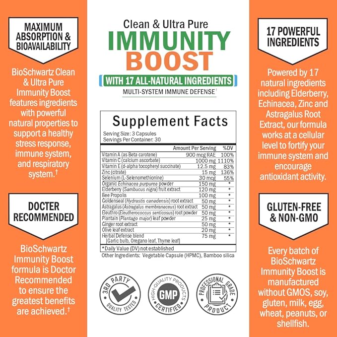 - Immune support: BioSchwartz immunity boost defense formula features vitamin c, zinc, vitamin A as beta carotenes, and 17 ingredients including elderberry & echinacea to help strengthen the body’s defenses and keep you protected year round with extra immunity support