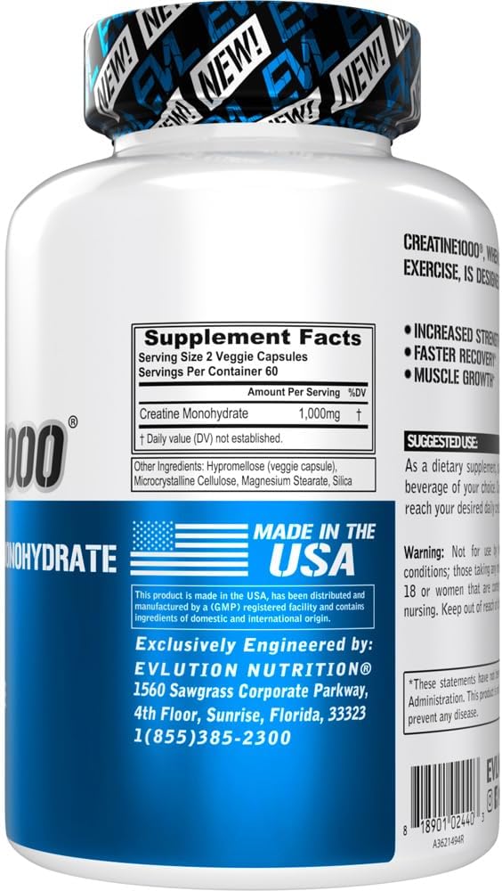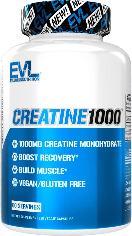 Evlution Pure Creatine Monohydrate Capsules 1000mg Nutrition Pre and Post Workout Recovery Vegan Creatine Pills for Muscle Gains and Muscle Recovery Supplement - Creatine Muscle Builder for Men