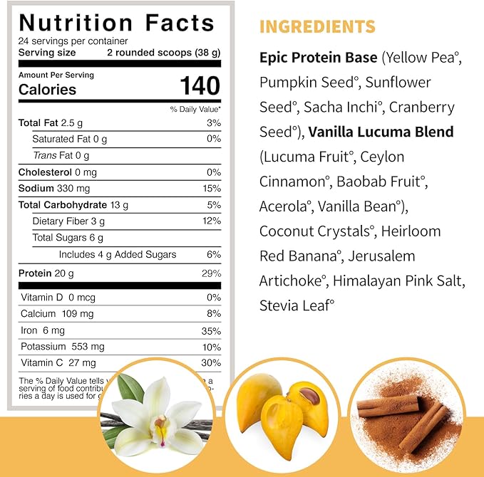 Sprout Living Epic Protein, Plant Based Protein & Superfoods Powder, Vanilla Lucuma Powder | 20 Grams Organic Protein Powder, Vegan, Non Dairy, Non-GMO, Gluten Free, Low Sugar (2 Pound, 24 Servings)