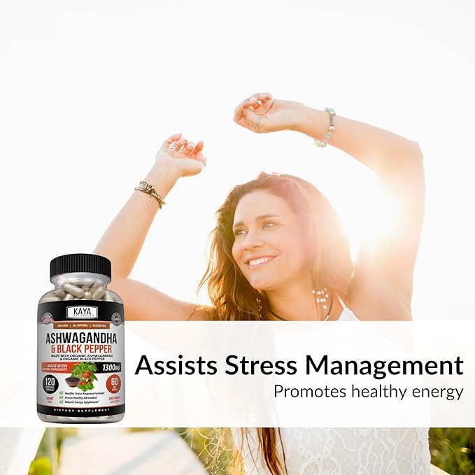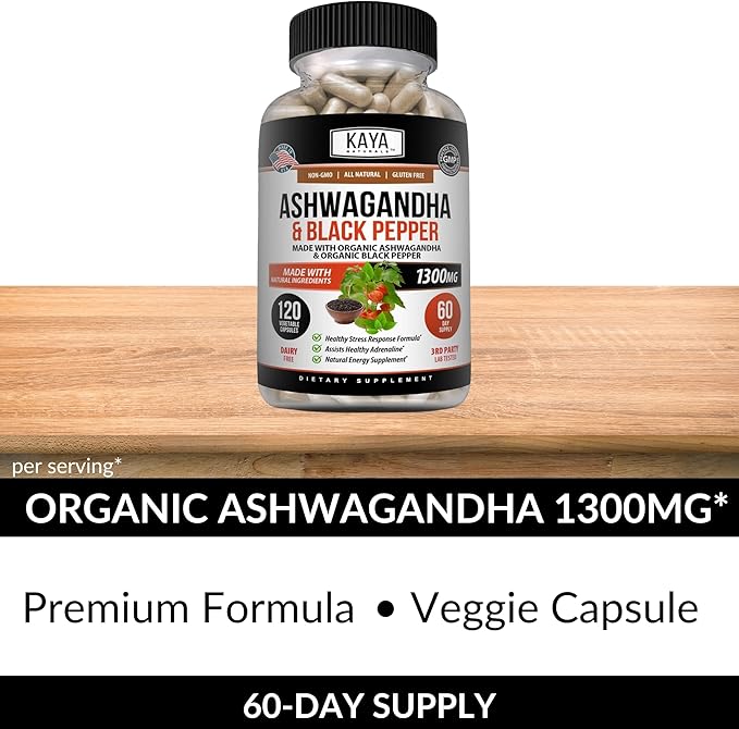 Kaya Naturals Organic Ashwagandha 1300mg, 120 Count Capsules for Stress Relief, Adrenal, Mood & Thyroid Support, Black Pepper and 100% Pure Ashwagandha -120 Capsules