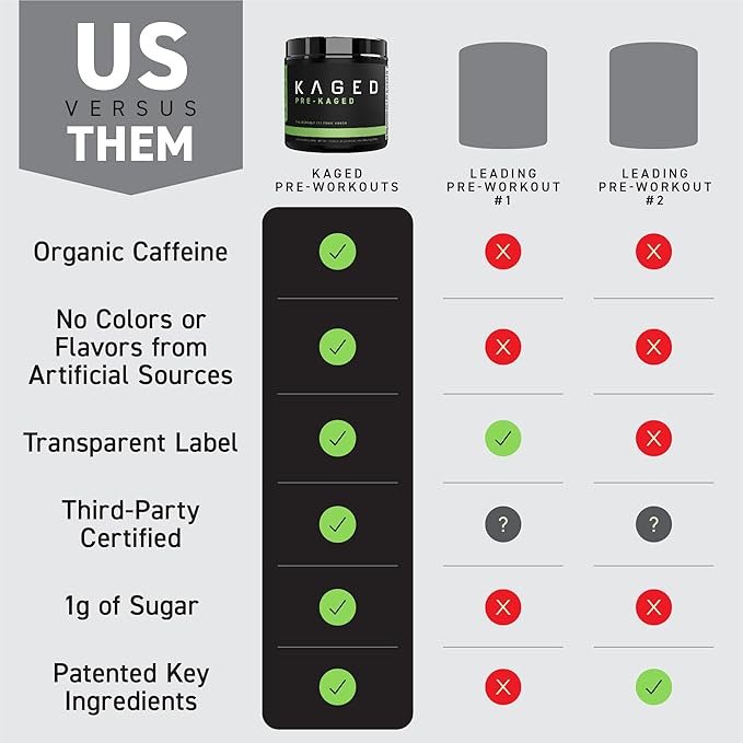 - The industry largest, most fully dosed scoop: With max dose ingredients, and a massive 32g per serving, just one scoop does it all. Kaged Muscle is a health-forward brand, so like all our products, PRE-KAGED has been 3rd party tested, screened for banned-substances, and our ingredient profiles are transparent. So, even the most meticulous athletes can see exactly what they’re getting. There’s a reason it’s one of the highest-rated & most-awarded pre-workout supplements available.