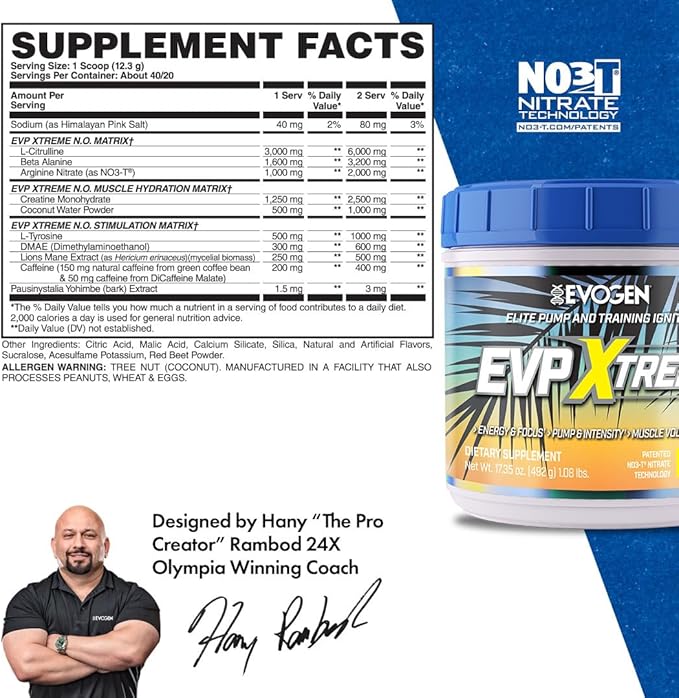 - DESIGNED BY THE PRO CREATOR – Developed by Hany Rambod, 25X Olympia-winning coach, EVP Xtreme N.O. is a clean pre workout supplement built on cutting-edge science to maximize pump, energy, and mental focus so you can train like a champion.