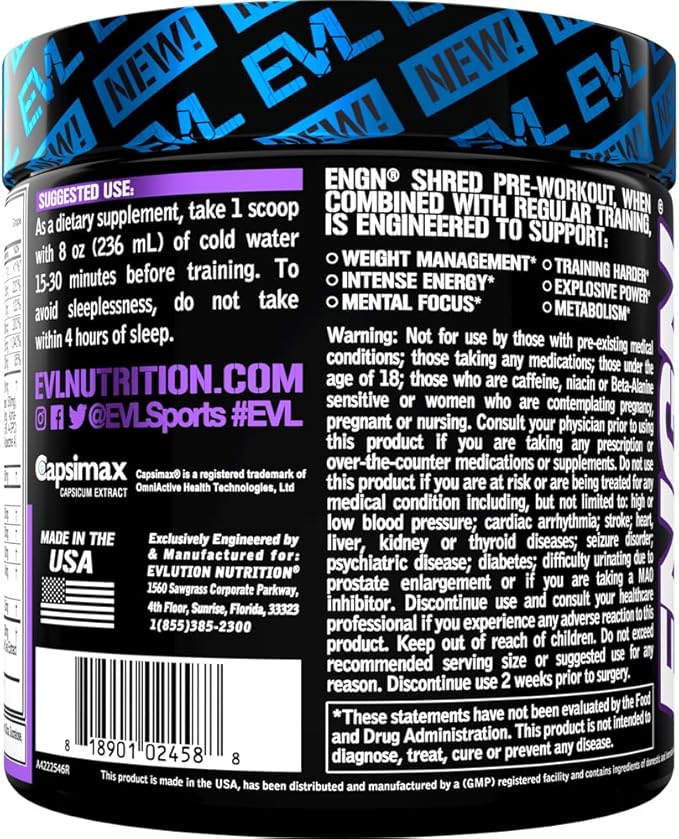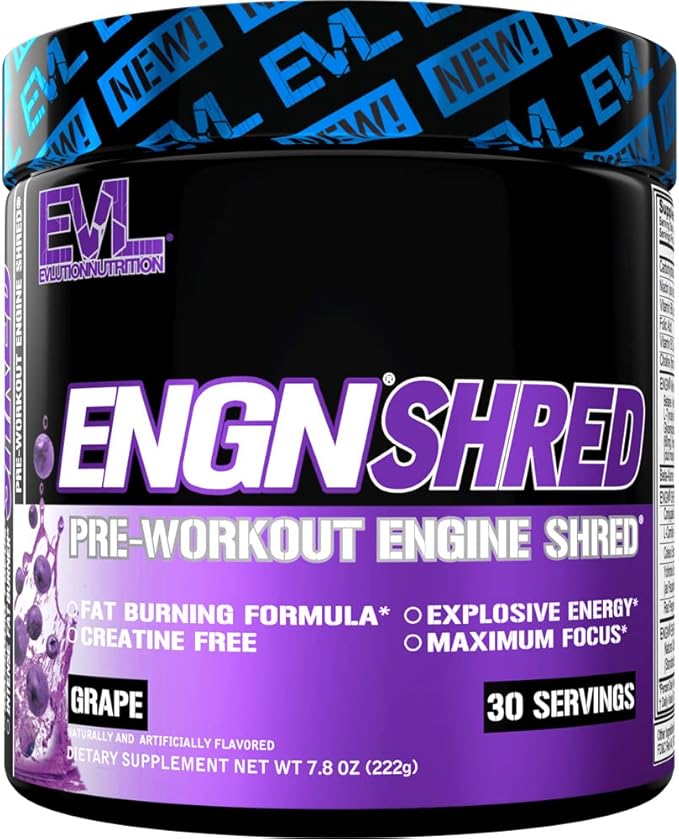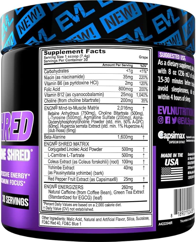 - Science Based Formula - Try the EVL ENGN Shred pre-workout energy and fat burner powder with exclusive ingredients including Beta alanine Agmatine Huperzine A L-Carnitine Yohimbe CLA and much more