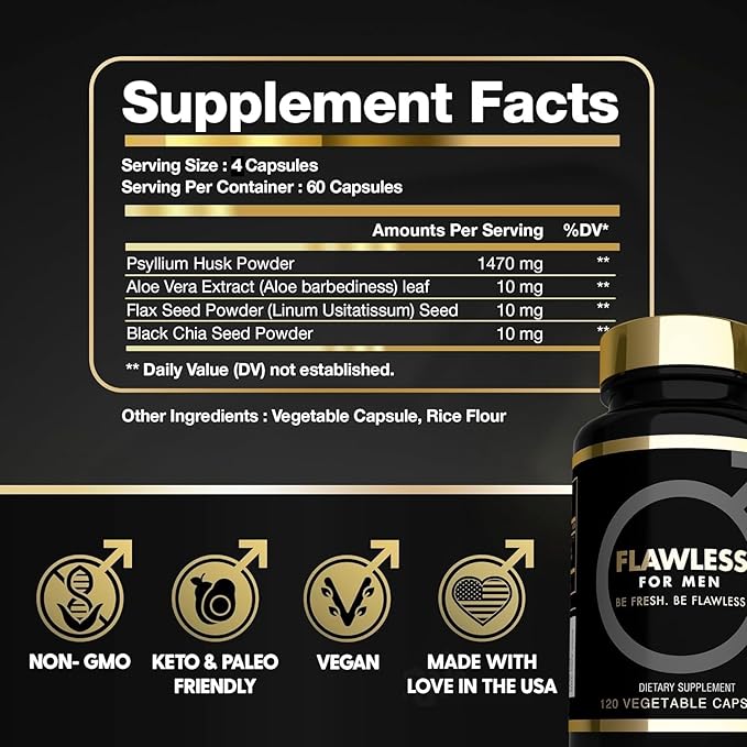 - ALL-NATURAL: Flawless for Men daily fibre physillium capsules are manufactured in a Federally inspected and GMP certified facility, third party lab tested for purity. Vegan, FREE FROM additives or binding agents is gluten, dairy, egg, fish, soy, and nut free.