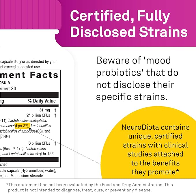 - Rare, Studied & Fully Identified Strains - Beware of mood probiotics, vitamins and supplements that do not disclose their exact probiotic strains. NeuroBiota contains three unique, rigorously researched strains not commonly found on the market.* All NeuroBiota strains are fully identified on the label.