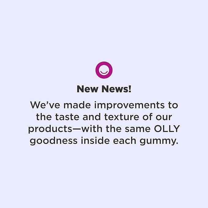- NEW NEWS: We’ve made improvements to the taste and texture of our products—with the same OLLY goodness inside each gummy