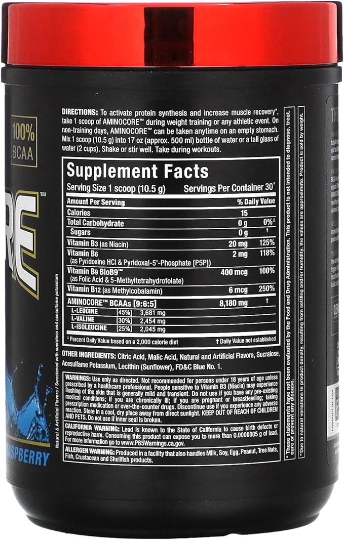 AMINOCORE BCAA – 8G BCAAs – 100% Pure Branch Chained Amino Acids – Gluten Free - Blue Raspberry - 315 Gram
