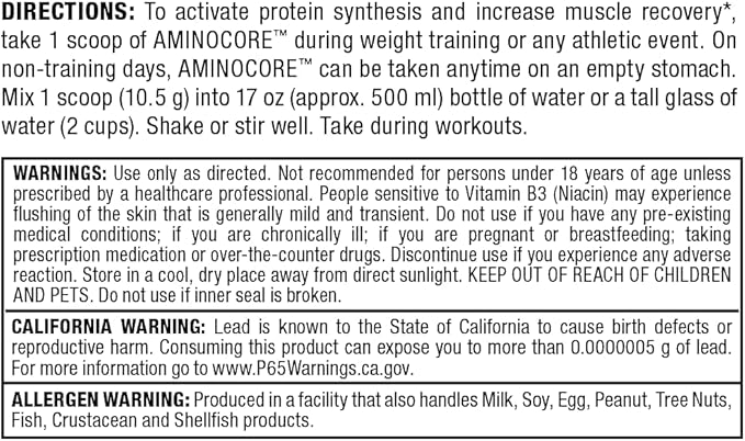 - ALL BCAAS ARE NOT CREATED EQUAL: AMINOCORE includes real BCAAs, not glutamine. It has pure, 9:6:5 ratio BCAAs and contains additional highly bioavailable B-vitamins not only enhance the anabolic environment, they help to release additional metabolic energy