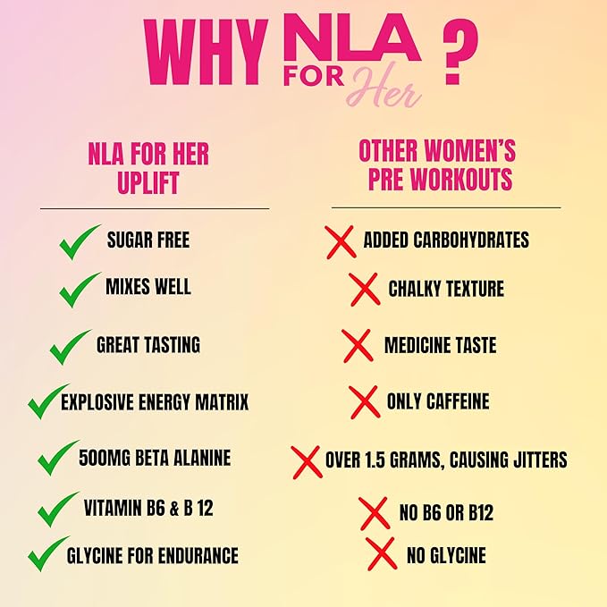 - 💪🏼 THE NLA DIFFERENCE: NLA for Her is the pioneer of women’s sports supplements! It’s our mission to provide women of all fitness levels with the highest quality, best tasting, effective sports supplements on the market!
