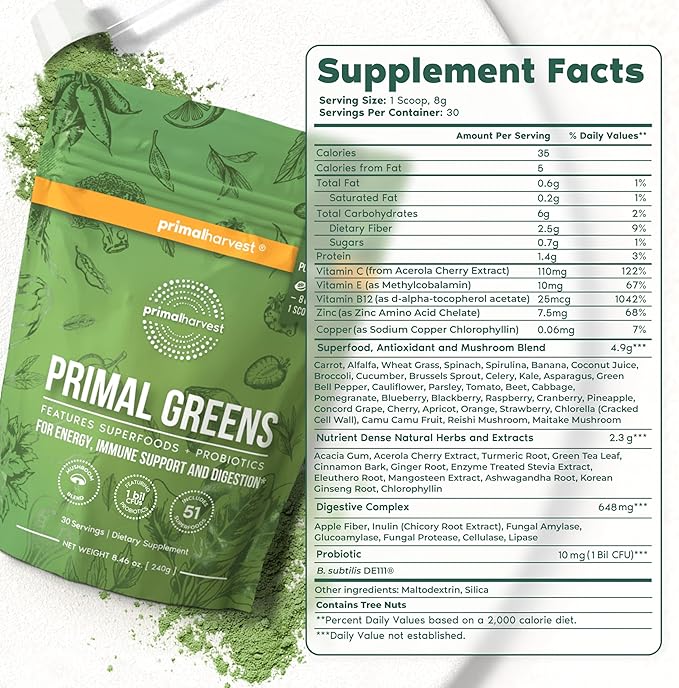 Primal Harvest Super Greens Powder, 30 Servings w/+50 Greens Superfood Chlorella, Probiotics, Green Tea, Wheatgrass, Kale, Turmeric for Energy,Primal Greens