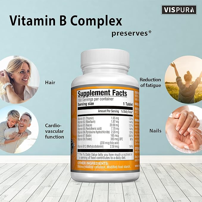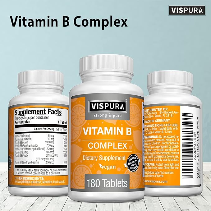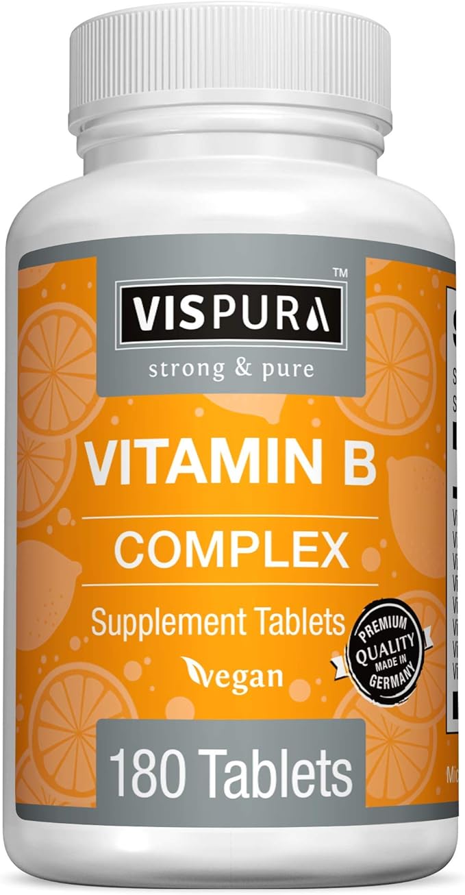 Vitamin B-Complex, 180 Vegan Tablets, All B Vitamins Including B12, B1, B2, B3, B5, B6, B7, B9, Folic Acid, for Stress, Energy and Healthy Immune System*, Natural Supplement Without Additives