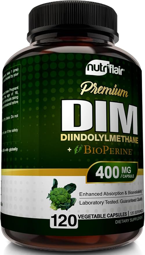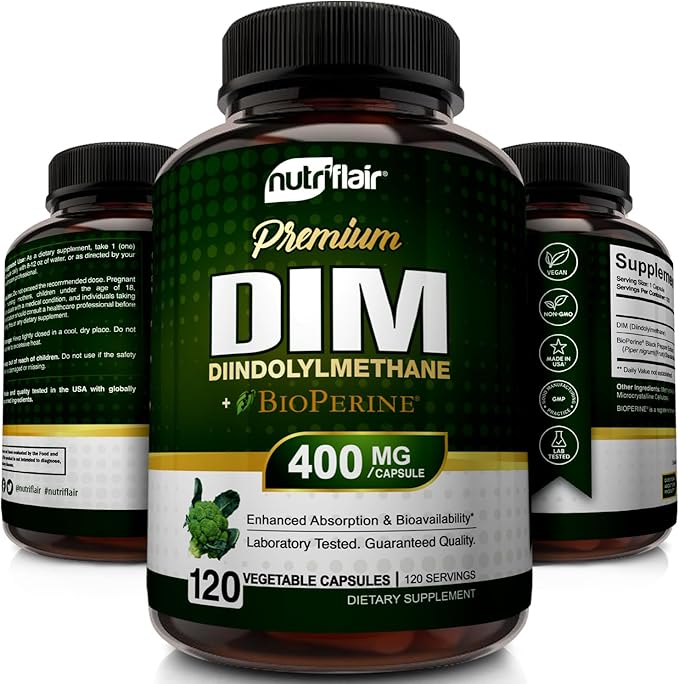 - ✔️ Highest Potency Available DIM Supplement: NutriFlair Premium DIM contain 400 milligrams per Capsule of the highest quality Diindolylmethane available, and 5mg of BioPerine (black pepper fruit extract) aiding in enhanced absorption and bioavailability. Don't settle for 250mg or 300mg. Maximize your results from this all natural, vegan DIM 400mg formula