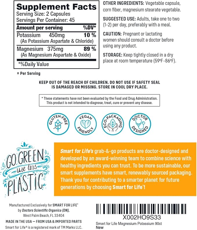 - DOCTOR DESIGNED, QUALITY ASSURED: Smart for Life Potassium Magnesium supplement is scientifically formulated for optimal health. All natural and non-GMO, this plant-based supplement is free of harmful chemicals and preservatives. Smart for Life products are made here in the USA and in an SQF Level 2 Certified facility. Having third party certification means these products comply with specific standards set for safety, quality and performance.