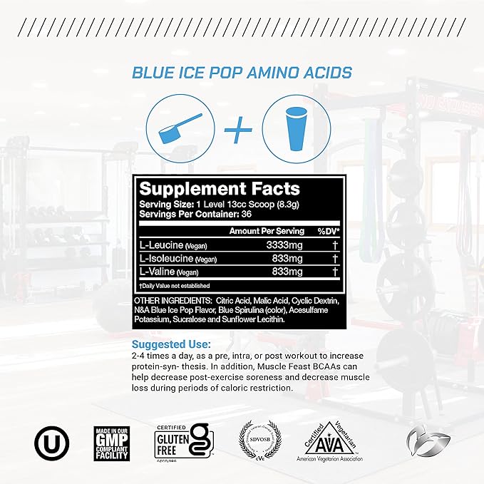 Muscle Feast Vegan BCAA Powder 4:1:1 Ratio Keto Friendly Sugar Free Post Workout Recovery, Blue Ice Pop, 300g